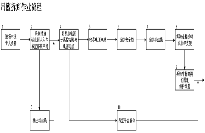 4、拆除步驟應(yīng)按照先拆除懸掛機(jī)構(gòu),后拆除工作平臺(tái)的程序進(jìn)行;
