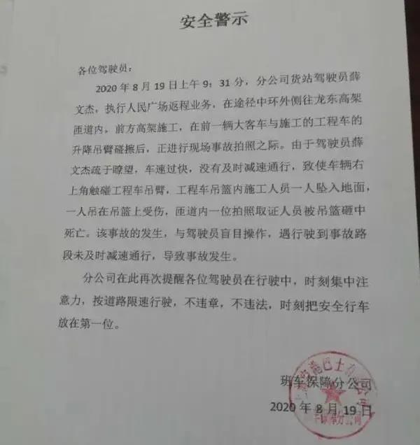 8月19日9時32分許,中環(huán)高速外圈近龍東大道附近,一載有24人的滬牌大客車撞到一輛正在施工的高架施工車,致2名作業(yè)工人跌落,其中1人跌至高架橋下身亡。
